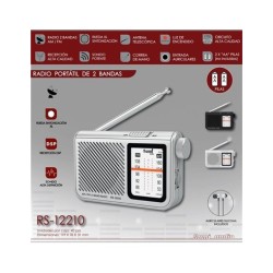 Radio Sami portátil 2 bandas ruedas XL recepción H PLATARadio portátil SAMI RS-12210 (plata) AM/FM, rueda XL e indicador de sintonía, antena telescópica, auriculares incluidos y correa de mano, funciona con 2×AA. Ref. RS12210P de SAMIEAN: 8435128475676La SAMI RS-12210P es una radio analógica horizontal de 2 bandas (AM/FM) pensada para uso diario. Incorpora rueda de sintonización XL e indicador de sintonía para localizar emisoras con facilidad, además de antena telescópica y recepción DSP para una señal estable. Incluye auriculares para escucha privada y correa de mano para transportarla cómodamente. Funciona con 2 pilas AA (no incluidas) y ofrece sonido potente en un formato compacto. Esta referencia corresponde a la variante plata (RS-12210P).Especificaciones técnicas:Marca / Modelo / Color: SAMI RS-12210P (plata).EAN (GTIN-13): 8435128475676 (SKU RS12210P).Bandas: AM / FM (sintonización analógica).Sintonía y recepción: Rueda XL, indicador de sintonización, recepción DSP.Antena: Telescópica.Audio / Accesorios: Auriculares incluidos, sonido potente.Transporte: Correa de mano.Alimentación: 2 × pilas AA (no incluidas).