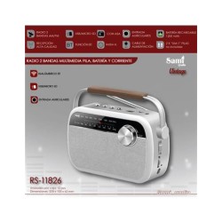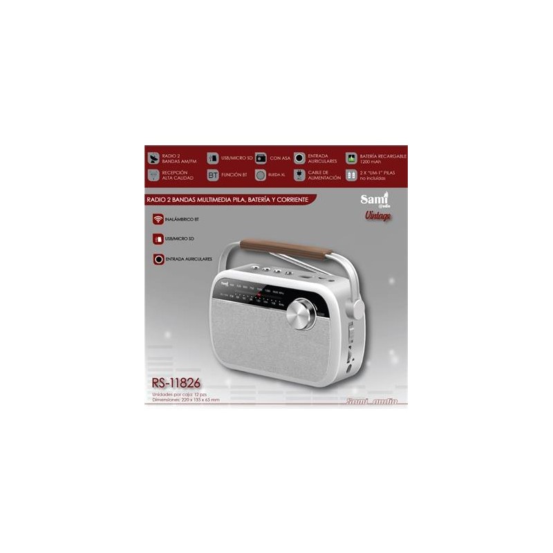 SAMI RADIO VINTAGE 2 BANDAS PLATAReferencia: RS11826- Radio de 2 bandas AM/FM- USB / Micro SD- Función bluetooth- Entrada auriculares- Rueda XL- Con asa y antena telescópica- Recepción de alta calidad- Batería recargable integrada de 1200 mAh- 2x UM-1 (no incluidas )