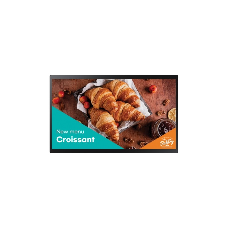Características - Interior Pantalla plana para señalización digital Negro - 61 cm (24") 1920 x 1080 Pixeles LED 250 cd / m² - Pantalla táctil 14 ms - Ethernet Wifi Especificaciones Exhibición Diagonal de la pantalla: 61 cm (24") Tecnología de visualización: LED Resolución de la pantalla: 1920 x 1080 Pixeles Brillo de pantalla: 250 cd / m² Tipo HD: Full HD Pantalla táctil: Si Tipo de pantalla: ADS Tecnología touchscreen: Capacitiva Mutitacto: Si Tiempo de respuesta: 14 ms Razón de contraste (típica): 1000:1 Nombre comercial de la relación de contraste dinámico: Mega Contrast Ángulo de visión, horizontal: 178° Ángulo de visión, vertical: 178° Tamaño de pixel: 0,2745 x 0,2745 mm Intervalo de escaneado horizontal: 56 - 84,5 kHz Intervalo de escaneado vertical: 48 - 75 Hz Índice de niebla: 25% Espacio de color RGB: NTSC Gama de colores: 72% Puertos e Interfaces Número de puertos HDMI: 1 Puerto DVI: No Cantidad de DisplayPorts: 0 Puerto USB: Si Ethernet: Si Wifi: Si Versión HDMI: 1.4 Cantidad de puertos de entrada HDMI: 1 Cantidad de puertos USB: 1 Ethernet LAN (RJ-45) cantidad de puertos: 1 RS-232: Si Puerto de datos infrarrojo: Si Entrada remoto (IR): 1 Diseño Diseño de producto: Pantalla plana para señalización digital Color del producto: Negro Colocación soportada: Interior montaje VESA: Si Forma de la pantalla: Plana Interfaz de panel de montaje: 100 x 100 mm Desempeño Utilizar con: Universal Horas de funcionamiento (horas/días): 16/7 HDCP: Si HDCP versión: 2.2 Control de energía Consumo energético: 38,5 W Consumo energético (en suspensión): 0,5 W Voltaje de entrada AC: 100 - 240 V Frecuencia de entrada AC: 50/60 Hz Sistema informático Sistema informático: Si Procesador incorporado: Si Tipo de sistema informático: Sistema en chip (SoC) Sistema operativo instalado: Tizen 7.0 Peso y dimensiones Ancho de la pantalla: 547,9 mm Profundidad de pantalla: 34,6 mm Altura de pantalla: 334,4 mm Peso de pantalla: 4 kg Empaquetado Ancho del paquete: 620 mm Profundidad del paquete: 122 mm Altura del paquete: 419 mm Volumen del paquete: 5200 cm³ Contenido del embalaje Cables incluidos: Poder Condiciones ambientales Intervalo de temperatura operativa: 0 - 40 °C Intervalo de humedad relativa para funcionamiento: 10 - 80% Detalles técnicos Certificados de sostenibilidad: EPEAT Bronze Certificados de conformidad: CE, China Compulsory Certification (CCC), Compatibilidad electromagnética (EMC), Comisión Federal de Comunicaciones (FCC) de Estados Unidos, KCC, RoHS, VCCI Otras características Bluetooth: Si Memoria Flash: 8000 MB Puertos de entrada RS-232: 1 Puertos de entrada RJ-45: 1 Salida de audio (mini jack): 1 Cumplimiento de sostenibilidad: Si
