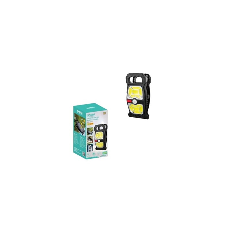 Lámpara solar.Tiene forma de pinza para poder enganchar donde quiera. Por un lado tiene el panel solar y por el otro la luz.Potencia: 50W.Opción de recarga por USB-C.Modelo: SD-6045.