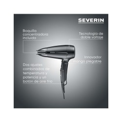 SEVERIN Secador de Pelo de Viaje, Secador de Pelo con Mango Plegable y Concentrador Extraíble, Doble Intensidad 110/220 V, Compacto 1600 W, Negro, HT 0159Marca SeverinColor NegroVataje 1600 vatiosFuente de alimentación Cable eléctricoComponentes incluidos Boquilla extraíble, Botón de aire fríoNombre del modelo HT 0159Número de ajustes 5Dimensiones del producto 25f. x 12an. x 8,8al. centímetrosTensión 220 Voltios (CA)Fabricante SEVERINLigero y ahorro de espacio: este secador de pelo compacto te hará la vida más fácil con su innovador mango plegable, mételo fácilmente en una bolsa de gimnasio o en una maleta, su almacenamiento será aún más sencillo ya que dispone de una anilla para colgar y pesa sólo 480 gPara llevar a cualquier lugar: utilizable en todo el mundo, se adapta a tomas de corriente de 110/220-240v, ya sea en casa o de viaje, mantén tu estilo estés donde estés con este secador de pelo portátil y su tecnología dual voltMáxima flexibilidad: 1.600 vatios para un secado más rápido, 2 niveles de calor/2 niveles de potencia ajustables para un peinado optimo y un botón de flujo de aire frío para fijar tu peinado, el cable de alimentación de 180 cm ofrece un gran radio de acciónResultados precisos: para un look más estructurado, el concentrador extraíble te permitirá dar rienda suelta a tu imaginaciónCalidad alemana: los productos severin son eficientes por su diseño, facilidad de uso y vida útilSecador de pelo de viaje SEVERIN: para un look optimo estés donde estés. El secador de pelo de viaje cuenta con un potente motor de 1600 vatios en un diseño inteligente y plegable. Con dos configuraciones de temperatura y potencia, así como un botón de aire frío, te brinda la flexibilidad de crear tu estilo como quieras. El práctico accesorio, un concentrador, garantiza resultados precisos. Optimo para viajar. Su pequeño extra: un cable de alimentación de 180 cm y un anillo para colgar para un fácil almacenamiento. LA marca SEVERIN: fundada en 1892 en Sundern, Alemania, el grupo SEVERIN fabrica electrodomésticos intuitivos, innovadores y duraderos. Los productos SEVERIN son eficientes en términos de diseño, facilidad de uso y vida útil. Con un catálogo de más de 350 electrodomésticos, SEVERIN innova para hacerte el día a día más fácil. Beneficios del producto en detalle: secador de pelo plegable para llevar a cualquier parte gracias a su tecnología Dual Volt. 2 configuraciones de potencia y calor + botón de flujo de aire frío. Boquilla desmontable. Ligero y compacto. Anillo para colgar. Cable de alimentación de 180 cm. Potencia: aprox. 1.600 W. Dimensiones (LxAnxAl): 15 X 7,9 X 26,5 cm. Peso: 480 g. Color: Negro. Referencia: HT 0159.Práctico y potenteEl secador de viaje SEVERIN HT 0159 es el compañero ideal para viajar, ir al gimnasio o estar en casa. Gracias a los dos ajustes combinados de temperatura y potencia, el secador se adapta perfectamente a los diferentes tipos de cabello. El botón de aire frío integrado fija el peinado y garantiza resultados duraderos.Libertad compacta: asa plegable para viajarLa innovadora asa plegable es la compañera ideal para viajar y hacer deporte. Basta con plegarla y guardarla para disfrutar de la máxima comodidad y ahorrar espacio.Listo para usar en cualquier parte: doble voltaje para un estilo sin límitesCon la flexible tecnología de doble voltaje de 110/220-240 V, estarás perfectamente equipada estés donde estés. Tanto en casa como de viaje.Control de peinado individual con dos ajustes combinados de temperatura y potenciaFijación perfecta y flexibilidad de peinado: con botón de aire frío para el ajuste.Resultados de peinado precisos gracias al accesorio concentrador desmontablePara un look perfecto: flujo de aire concentrado para peinados precisos.