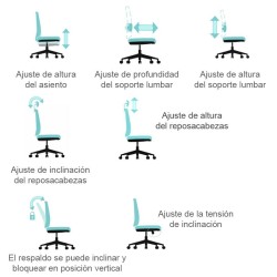 • El soporte lumbar se puede ajustar en altura y profundidad, proporcionando a los usuarios una gran comodidad.• Ofrece una buena sensación de sentado.• Reduce la tensión abdominal.• El respaldo se puede inclinar y bloquear en una posición.• Brazos regulables en altura.• Pistón elevador de gas Clase 4.• Base de nailon.