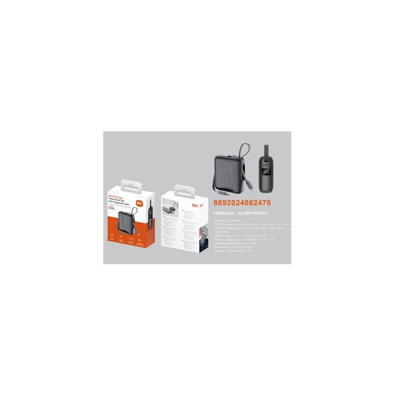Sio. PB01 Power Bank con cable de carga rápida 22.5W+PD20W 10000mAhSio. PB01 Power Bank Con Cable Carga Rapida 22.5W+PD20W 10000mAhCapacidad: 10000 mAh TIPO CSalida: 5 V-3 A/9 V-2,22 A/10 V-2,25 A/12 V-1,67 A, cable tipo CSalida: 5 V-3 A/9 V-2,22 A/10 V-2,25 A/10K0)22.Wuype cooPrecharee12V-1.67AEntrada TIPO C: 5 V-3 A / 9 V-2 A / 12 V-1,5 AEntrada de cable TIPO C: 5 V-3 A/9 V-2 A/12 V-1,5 ASalida del cable Lightning: 5 V-2,4 ADimensiones: 73 x 63,5 x 26,5 mm. Material: ABS + PC ignífugo.