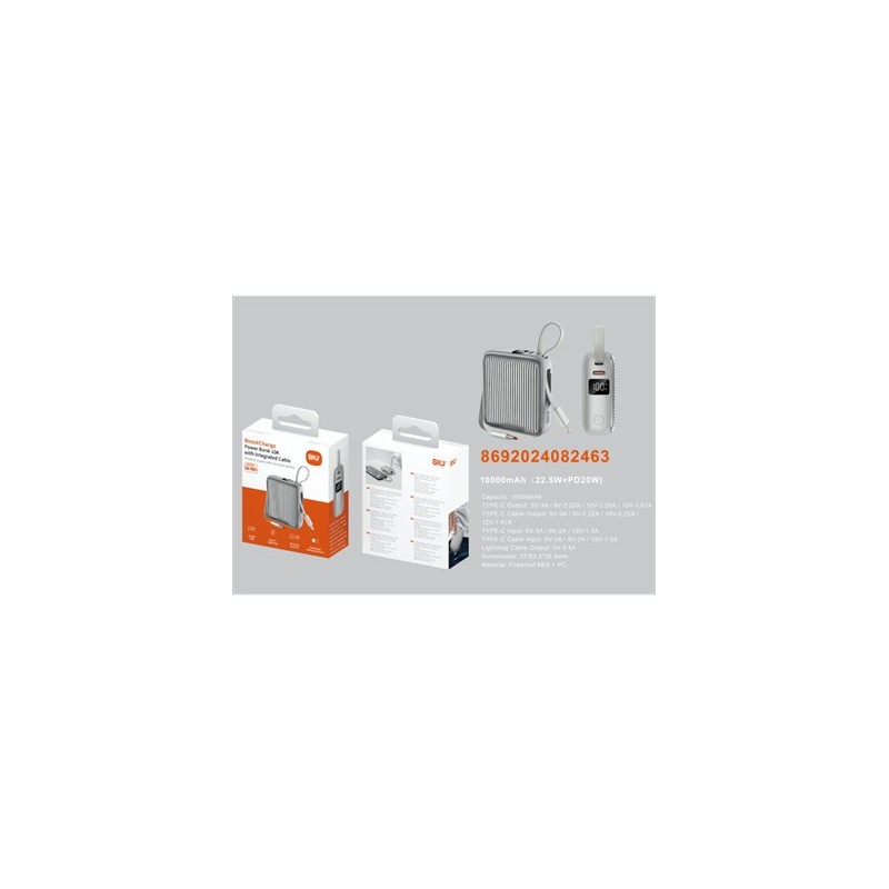 Sio. PB01 Power Bank con cable de carga rápida 22.5W+PD20W 10000mAhSio. PB01 Power Bank Con Cable Carga Rapida 22.5W+PD20W 10000mAhCapacidad: 10000 mAh TIPO CSalida: 5 V-3 A/9 V-2,22 A/10 V-2,25 A/12 V-1,67 A, cable tipo CSalida: 5 V-3 A/9 V-2,22 A/10 V-2,25 A/10K0)22.Wuype cooPrecharee12V-1.67AEntrada TIPO C: 5 V-3 A / 9 V-2 A / 12 V-1,5 AEntrada de cable TIPO C: 5 V-3 A/9 V-2 A/12 V-1,5 ASalida del cable Lightning: 5 V-2,4 ADimensiones: 73 x 63,5 x 26,5 mm. Material: ABS + PC ignífugo.