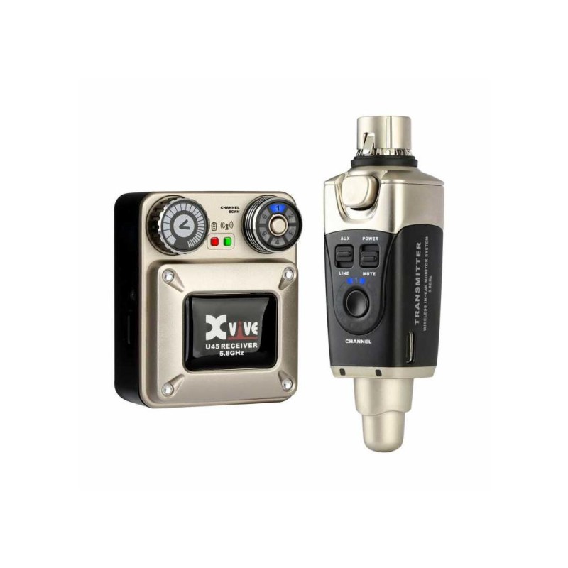 WIRELESS IN EAR SYSTEM.XVIVE Monitor in-ear / personal U45. Sistema inalámbrico U45 para monitorización in-ear. - Ligero y compacto- Emisor y receptor recargables que funcionan en la banda de frecuencias de 5,8 GHz- Interruptor Aux/Line- Salida minijack estéreo- Conversión A/D de 24 bits/48 kHz, transmisión digital sin comprimir- 6 canales- Alcance de hasta 30 m (sin obstáculos)- Respuesta en frecuencia: de 20 Hz a 20 kHz- Latencia inferior a 5 ms- Rango dinámico 110 dB- Relación señal/ruido 110 dB- Alrededor de 5 horas de autonomía- Cable USB incluido- Robustas carcasas de ABS- Entregado con adaptador XLR macho a jack mono de 6,35 mm y tapa- Peso: 90 g (transmisor) y 118 g (receptor)