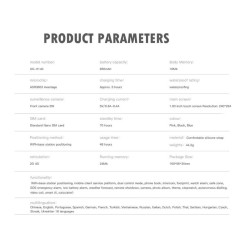 • Smartwatch kids 4G.• Cámara frontal de 8 W.• Tipo de tarjeta compatible Nano SIM estándar con función de red GSM (se envía sin tarjeta).• Modo de ubicación WIFI + posicionamiento de estación base.• Funciones WIFI + posicionamiento de estación base, plataforma de servicio al cliente móvil, modo de control dual, agenda telefónica, intercomunicador, huella, reloj despertador, área segura, alarma de emergencia SOS, alarma de batería baja, pronóstico del tiempo, apagado remoto, cámara, foto Álbum, tema, cronómetro, marcación autónoma, videollamada, IA inteligente, calculadora.• Medida correa 210.5X21X2 mm.• Edad aplicable 3 a 12 años.