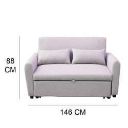• Sofá cama de dos plazas.• Estructura de madera maciza.• Relleno de espuma de alta densidad.• Tapizado en fibra de poliéster.• Medidas cerrado: 146x87x88 cm (Ancho x Profundidad x Alto).• Medidas abierto: 146x135x88 cm  (Ancho x Profundidad x Alto).