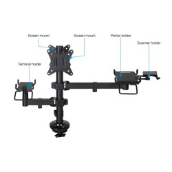 Optimiza tu punto de venta con el Soporte AVPos Multi-Stand, la solución definitiva para organizar tu TPV. Este brazo articulado permite montar dos monitores de hasta 32", una impresora de tickets y un terminal de pago, creando un espacio de trabajo profesional, ergonómico y despejado. Su robusta construcción en metal y sistema de gestión de cables garantizan una instalación limpia y duradera.