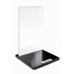 Descripción comercial: Soporte publicitario AVPOS con portacarteles transparente y base negra con alojamiento para avisador. Presenta ofertas en mesa y permite el aviso del cliente con imagen limpia y profesional.