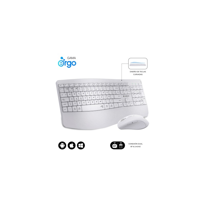 Descubre la experiencia definitiva en ergonomía y usabilidad con el Combo Dual Prowave de SUBBLIM, un pack de teclado y ratón ergonómicos que cuidan tu salud postural y multiplican tu productividad. Diseñado para quienes pasan largas horas frente al ordenador, te ayuda a mantener una postura más cómoda y natural, reduciendo la fatiga en las muñecas a la vez que mejora la precisión en tus tareas diarias. Gracias a su conectividad avanzada, su diseño inteligente y sus múltiples prestaciones, disfrutarás de un entorno de trabajo o de ocio sumamente eficiente, silencioso y adaptable a cualquier espacio. Con el Combo Dual Prowave, SUBBLIM pone al alcance de tu mano la perfecta combinación de confort, rendimiento y versatilidad, para que disfrutes de una jornada más relajada y productiva.CARACTERÍSTICAS:Diseño Ergonómico del Teclado. El teclado ergonómico cuenta con una forma ligeramente curva que guía tus manos hacia la posición natural. Su reposamuñecas integrado reduce la tensión en la parte baja de las manos, manteniéndolas elevadas para evitar presiones innecesarias. Además, presenta dos ángulos de inclinación (4° y 8°) para que lo ajustes según tu comodidad. Ideal para tareas intensivas de mecanografía, este diseño te garantiza una experiencia más confortable a lo largo de toda la jornada.Teclas Cóncavas y Silenciosas. Cada tecla está diseñada con una superficie cóncava que dirige tus dedos al centro, minimizando errores involuntarios. Gracias a su estructura de alta calidad, obtendrás un tacto firme y silencioso en cada pulsación, haciendo que teclear sea un placer incluso en entornos compartidos o silenciosos.Conexión Dual Multidispositivo. Uno de los grandes atractivos del Combo Dual Prowave es su versatilidad de uso. Incorpora Bluetooth 5.3 y un receptor USB 2.4G, lo que te permite conectar hasta tres dispositivos de manera simultánea. Con solo pulsar el botón correspondiente (BT1, BT2 o 2.4G), el teclado y ratón inalámbricos se vinculan al instante con el dispositivo que elijas: PC, portátil, tablet o smartphone.Estilo elegante y compacto con sección numérica.Baterías Recargables y Ahorro de Energía. Olvídate de cambiar pilas. Tanto el teclado como el ratón cuentan con baterías de litio recargables (800 mAh en el teclado y 500 mAh en el ratón), garantizando horas de uso continuo. Además, integran un sistema de suspensión automática para optimizar la duración de la batería, reactivándose en solo 2-3 segundos al presionar cualquier tecla.Teclado Numérico y Orificios de Drenaje. Para quienes trabajan con datos y números, el teclado numérico simplifica la introducción de información en hojas de cálculo y programas de contabilidad. Asimismo, los orificios de drenaje protegen los componentes de derrames accidentales, prolongando la vida útil del teclado y evitando averías no deseadas.Ratón Ergo Inalámbrico. El pack se completa con un ratón ergonómico, pensado para adaptarse a la perfección a la mano derecha. Dispone de botones laterales de “Avanzar” y “Retroceder” y un tacto suave con clic silencioso. Además, puedes ajustar su DPI entre 800/1200/1600/3200 para obtener la sensibilidad y precisión que mejor se ajuste a tu estilo de trabajo o juego.