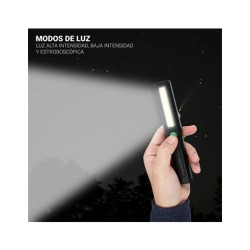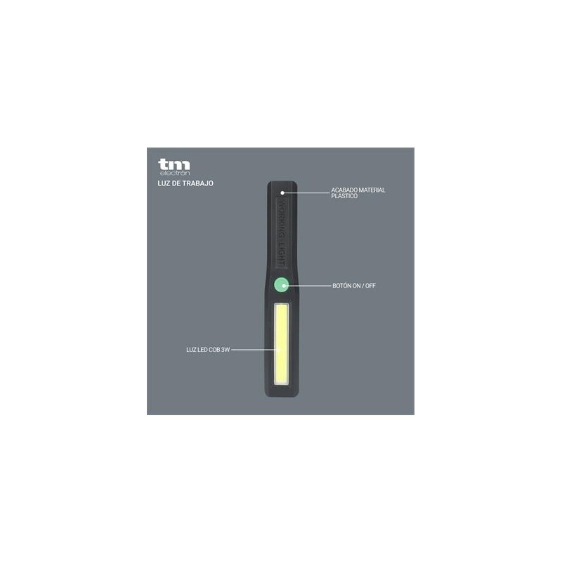 Luz de trabajo TMTOR032TMTOR032 Luz de trabajo LED de TM Electron en rojo, verde, naranja y azul, con potente imán en su parte trasera. Ideal para el garaje, el taller, la casa o incluso para llevar en el coche gracias a su potente LED COB de 3W que consigue una potencia lumínica excepcional.La luz de trabajo monta un LED COB de 3W que consigue un alto rendimiento lumínico de hasta 120 lúmenes/ vatio.Comprende un ratio 2 veces superior al rendimiento de un LED convencional.Incluye un sistema con 3 modos de luz conmutables: alta intensidad, baja intensidad y luz estroboscópica.Elige el modo que más te convenga pulsado un solo botón.En la parte trasera se encuentra un fuerte imán de forma que se puede colgar de cualquier superficie metálica para una mayor versatilidad a la hora de conseguir una mejor iluminación.Gracias a su acabado en plástico resistente de alta calidad te proporcionará una durabilidad a toda prueba ya sea uso profesional o como para tus acampadas al aire libre.Su compacto tamaño de 17×2,8×1,8 cm lo convierte en la herramienta ideal que no ocupa nada de espacio y que tiene un peso contenido de tan solo 150g. Atención:Preste atención al ánodo y cátodo de la pila cuando lo ponga en el compartimento de las pilas. No irradie los ojos directamente, el brillo de la luz es perjudicial para los ojos. Cuando la luz falle, reemplace las pilas desgastadas por nuevas de gran capacidad. Es aconsejable retirar la pila cuando no vaya a usar la linterna por algún tiempo.