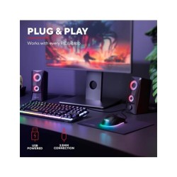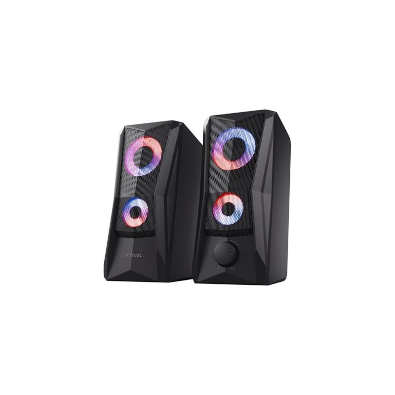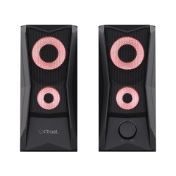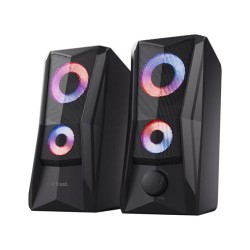 Trust Gaming GXT 606B Javv Altavoces PC Gaming 2.0 con Iluminación RGB, 12W (6W RMS), Alimentación USB, Jack 3,5 mm, Altavoz Estéreo, Sistema de Altavoces para Ordenador, Portátil - NegroMarca Trust GamingPotencia de salida máxima del altavoz 12 WatiosTecnología de conectividad AuxiliarModo de salida de audio EstéreoTipo de montaje Tabletop MountMaterial metalNombre del modelo GXT 606B JavvTipo de altavoz SatéliteFunción especial Iluminación RGB, Alimentación USBUsos recomendados para el producto Para ordenadoresACTUALIZACIÓN – Con su atrevido diseño, su excelente calidad de audio y su efecto de iluminación RGB, este altavoz para PC es ideal para cualquier configuración de juegoSONIDO ESTÉREO – El altavoz produce 12 W de potencia máxima (6 W RMS) y, por lo tanto, es un gran complemento para tu portátil o PC para juegosSONIDO DE COLORES – Con iluminación LED RGB controlada por tacto y cambio automático de 16,8 millones de colores, con Javv llamarás la atenciónDISEÑO ESTILIZADO – Las rejillas metálicas de la parte delantera de los altavoces no solo son bonitas, sino que también protegen los controladores del altavoz USB. ¡Estilo y elegancia!PLUG &, PLAY – El altavoz gaming Javv se alimenta por USB, sin necesidad de un enchufe adicional. Ajusta el volumen fácilmente con el mando de control situado en la parte delantera del altavoz derechoTrust Gaming GXT 606B Javv Altavoces PC Gaming 2.0 con Iluminación RGBPotencia máxima de 12 W (6 vatios RMS)Iluminación con ciclo de colores RGB con control táctil de apagado/encendidoMando del volumen de fácil acceso en la parte delanteraRejilla metálica para protección adicionalAlimentado por USB, no requiere alimentación de redFunciona con todos los PC/ordenadores portátilesAltavoz pequeño, gran sonidoPequeño pero potente, Javv demuestra que el mejor perfume se guarda en frascos pequeños. Con una potencia máxima de 12 W (RMS de 6 W), este compacto juego de altavoces 2.0 no ocupa mucho espacio en el escritorio, pero su presencia no pasa desapercibida.Ilumina la nocheJavv tiene ambas cosas: iluminación RGB y unos graves realmente buenos. Pon la fiesta en marcha con la iluminación LED RGB del altavoz, y acciónalo con un sencillo control táctil de encendido/apagado en la parte superior.Conecta y reproduce (¡ese temazo!)Anímate de inmediato al son de la música gracias a la prestación Plug &, Play de Javv. La conexión de 3,5 mm y el conector USB permiten conectar este altavoz directamente, sin necesidad de una toma eléctrica de pared, para que disfrutes de un sonido excepcional en segundos.