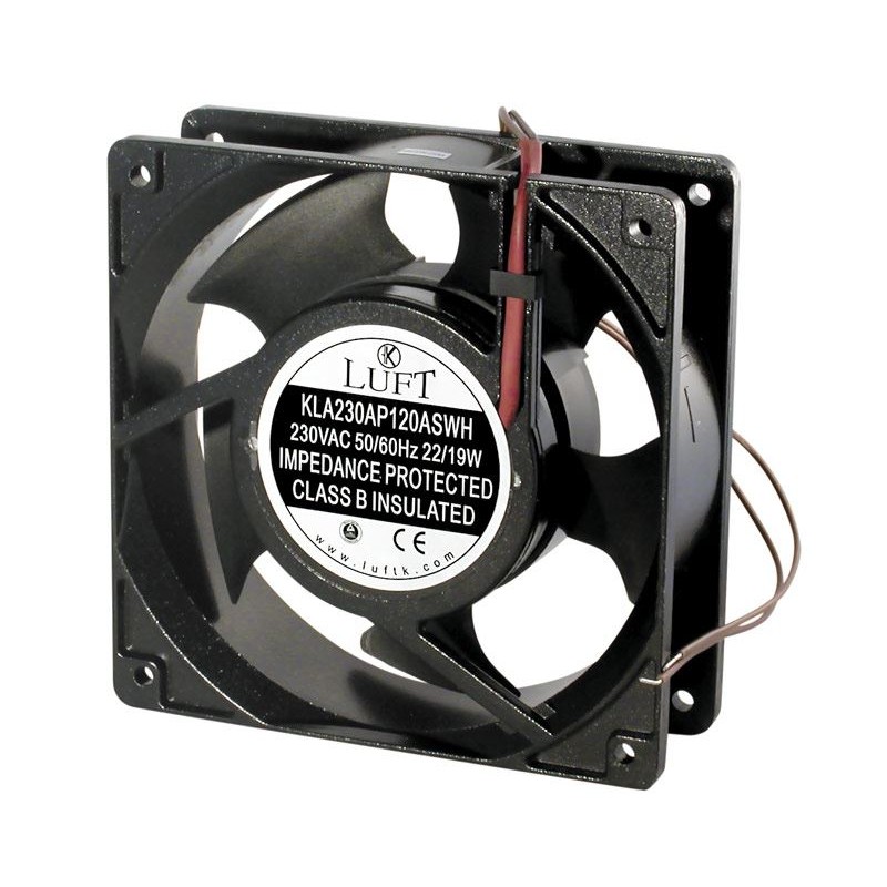 Ventilador 120x120x38mm 220Vac 19/22W casquillo. Consumo.: 110/135mA. 2650/3000RPM. Caudal aire: 89/100CFM. Nivel Ruido: 46/48dB. Cuerpo de aluminio, hélice de plastico. (KLA230AP120ASWH)