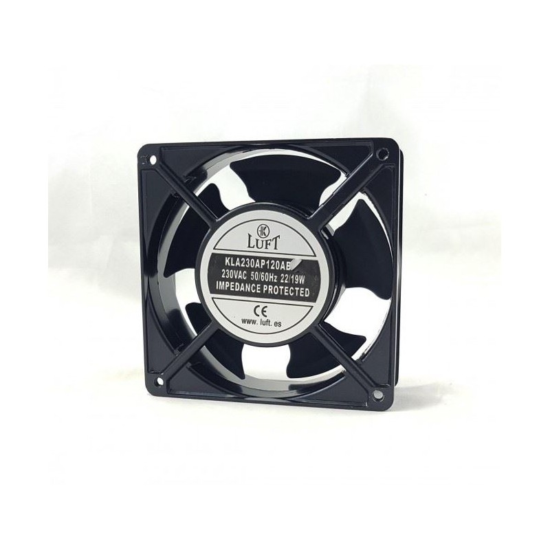 Ventilador 120x120x38 220Vac 19/22W rodamientos. Consumo: 110/135mA. 2650/3000RPM. Caudal aire 89/100CFM. Nivel ruido 46/48dB. Cuerpo de aluminio, hélice de plástico. (KLA230AP120ABWH)