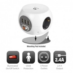 El EW3939 tiene un diseño cúbico que ahorra espacio y ocupa un espacio limitado en su escritorio. Fácil acceso a todas las salidas de alimentación y puertos USB. La almohadilla de montaje incluida garantiza que la toma de corriente permanezca en su sitio.