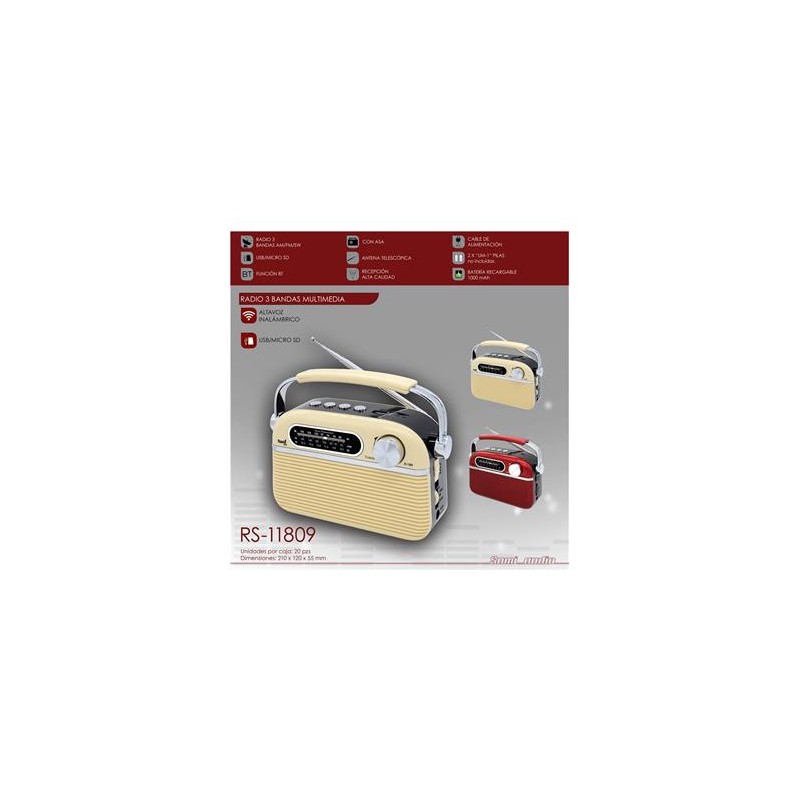 SAMI Radio Portatil AM/FM/SW RS-11809 Retro Bluetooth Micro Sd Usb Aux In Diseño Madera Rojo