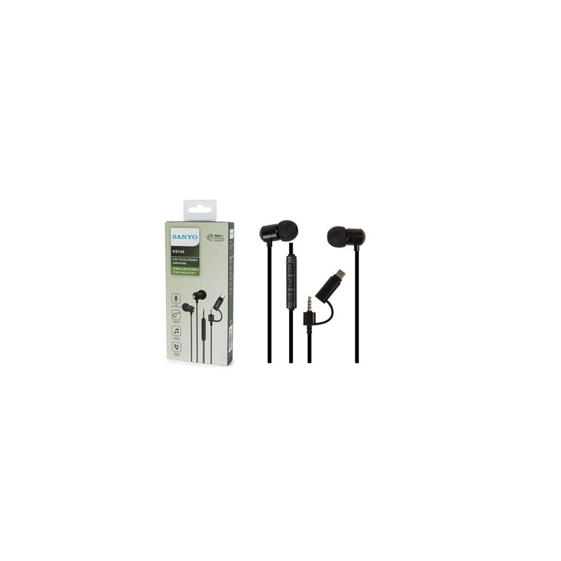 SANYO Auricular Con Cable 2 En 1 Mini Jack/Tipo C KS144 Microfono Negro